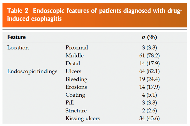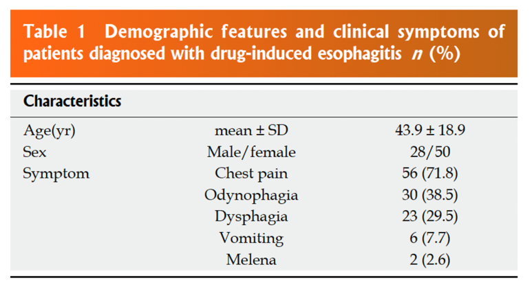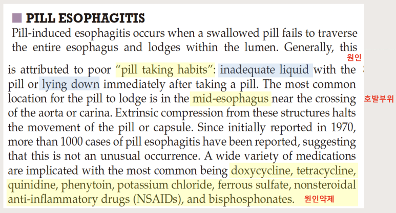 세실 26판 호발연령, 증상 한국에서 진행된 연구 자료에 따르면 약물유발식도염의 호발연령은 평균 43세로 주로 여성에서 발생하며 주요 증상은 흉통이 가장 많고 삼키기통, 연하곤란, 구토 순으로 많이 나타났습니다.