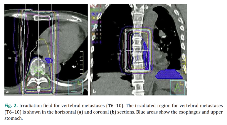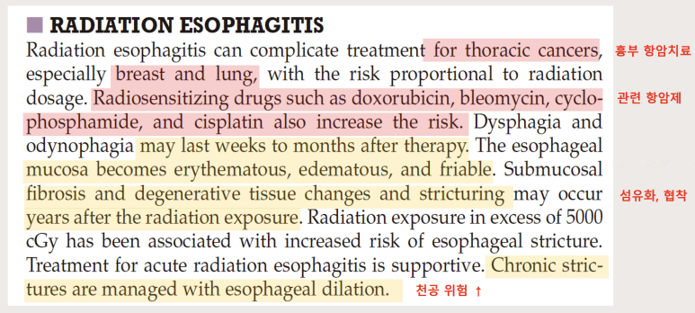 해리슨 20판 병리전의 아래 그림과 같이 척추에 전이가 일어나 방사선 치료를 하지만 식도가 가까이 있기 때문에 방사선이 의도치 않게 식도까지 도달하여 손상을 줍니다.