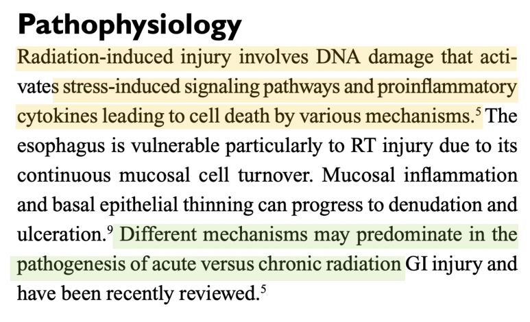 유발식도염의 주요 병리 전에는 방사선 자체가 식도점막세포의 DNA에 손상을 줌으로써 다양한 염증반응을 유도하고 손상이 생기는 것으로 알려져 있습니다.