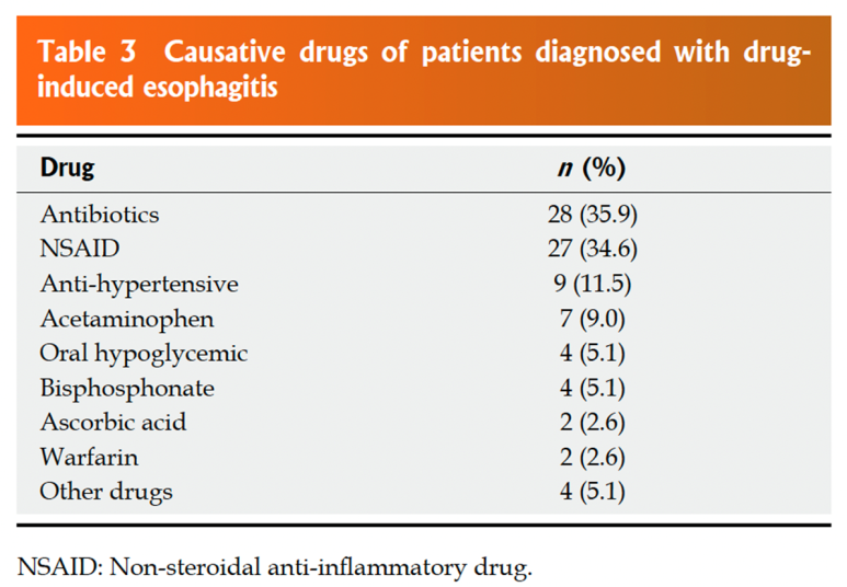 원인 약제가 가장 일반적인 원인 약제로는 항생제가 35%를 차지하며, 그 다음으로 진통 소염제가 일반적으로 보고되고 있습니다.주목할 만한 것은 고혈압 약제, 타이레놀 약제에 의해서도 식도염이 발생했습니다.