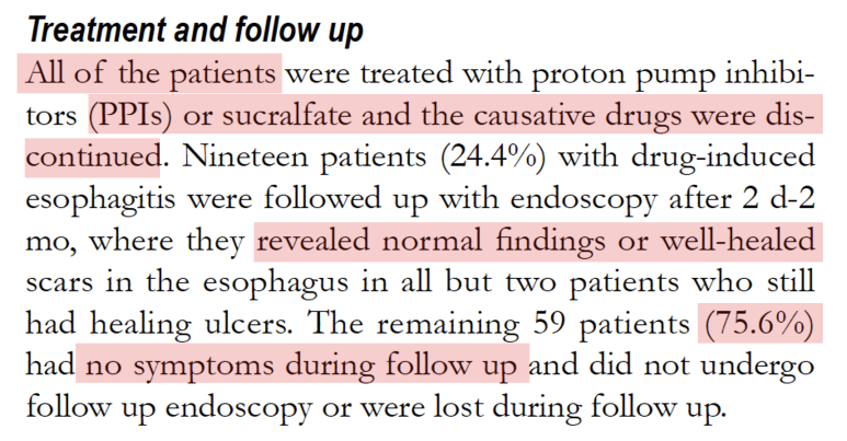 치료방법 치료방법은 교과서에서는 증거가 부족하다고 하지만 실제 임상에서는 PPI 또는 sucralfate를 사용하여 원인약제의 복용을 중단하는 보존적 치료를 시행합니다. 실제로 이러한 치료로 대부분의 환자가 증상이 좋아지는 것으로 알려져 있습니다.