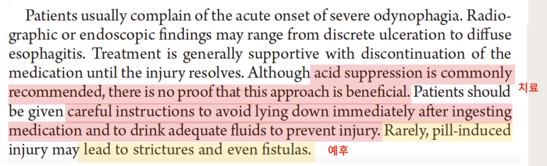 해리슨 20판 약제 중 산성 부식제로 작용하는 약제로는 비타민C, 철분제 등이 있으며 알칼리성 부식제로 작용하는 약제는 골다공증 약제 등이 있습니다. 반면 항생제는 직접적으로 식도 점막을 손상시키는 것으로 알려져 있습니다.이러한 손상은 특히 이전에 식도 손상의 후유증으로 협착이 있었거나 대동맥활이 바깥쪽에서 안쪽으로 식도내강을 누름으로써 협착이 생긴 부위에 호착하는 것으로 알려져 있습니다.