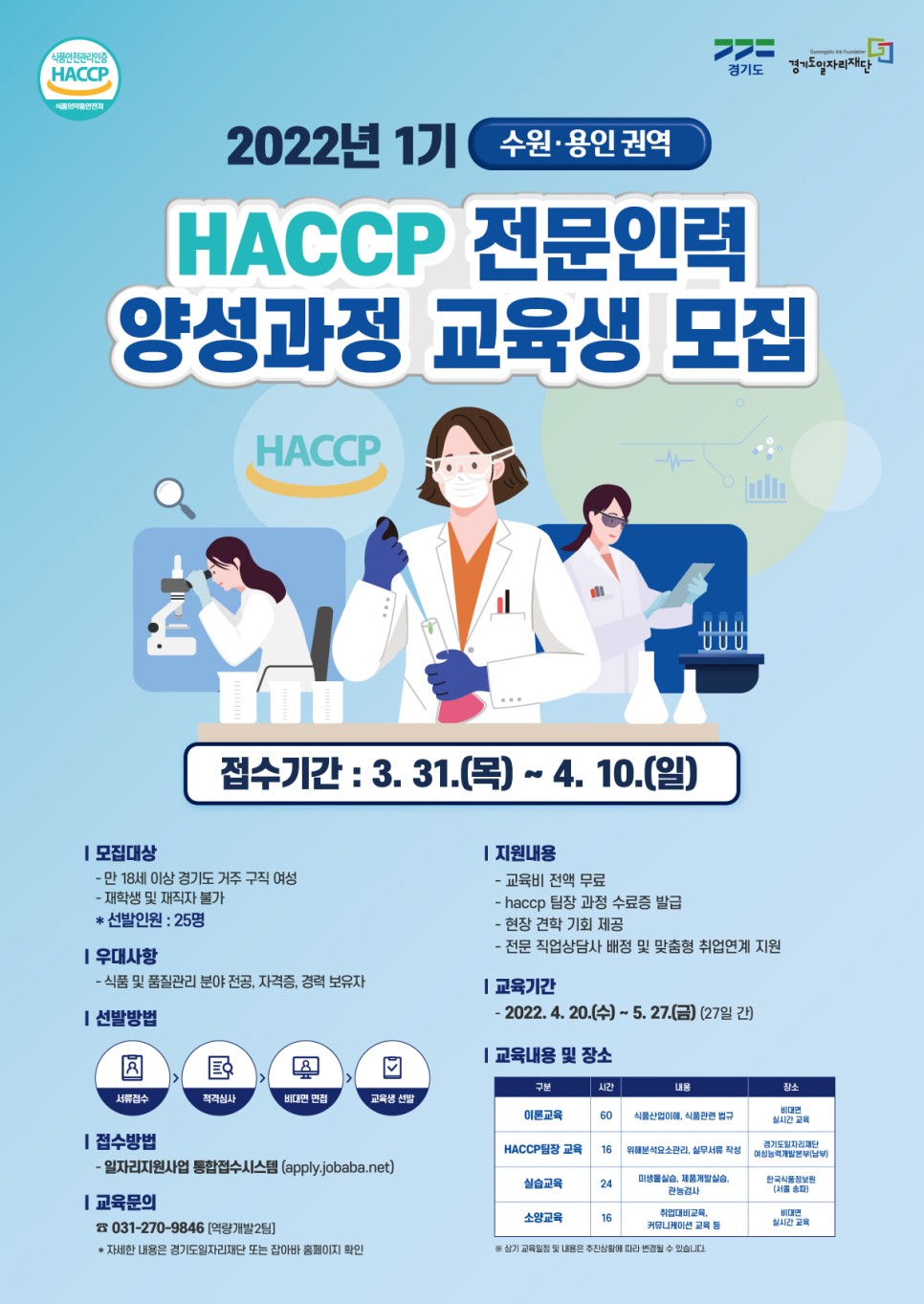 사업개요1) 사업명 : 2022년 HACCP 전문인력양성과정2) 사업내용 : HACCP 관련분야 여성에게 전문적인 교육을 제공함으로써 안정적 전문직 고용연계 촉진3) 선발일정 – 모집기간 : 2022년 3월 31일(목) 9:00~4월 10일(일) 24:00(11일) – 고용연계 촉진3) 선발일정 – 모집기간 : 2022년 3월 31일(목) 신청자 선정대상 : 24:00~4월 11일(일(목) – 4월 11일(일) 면접자 선정일) 24:00일정 및 재단 발표(일정 및 24:00) – 적격심사 : 4월