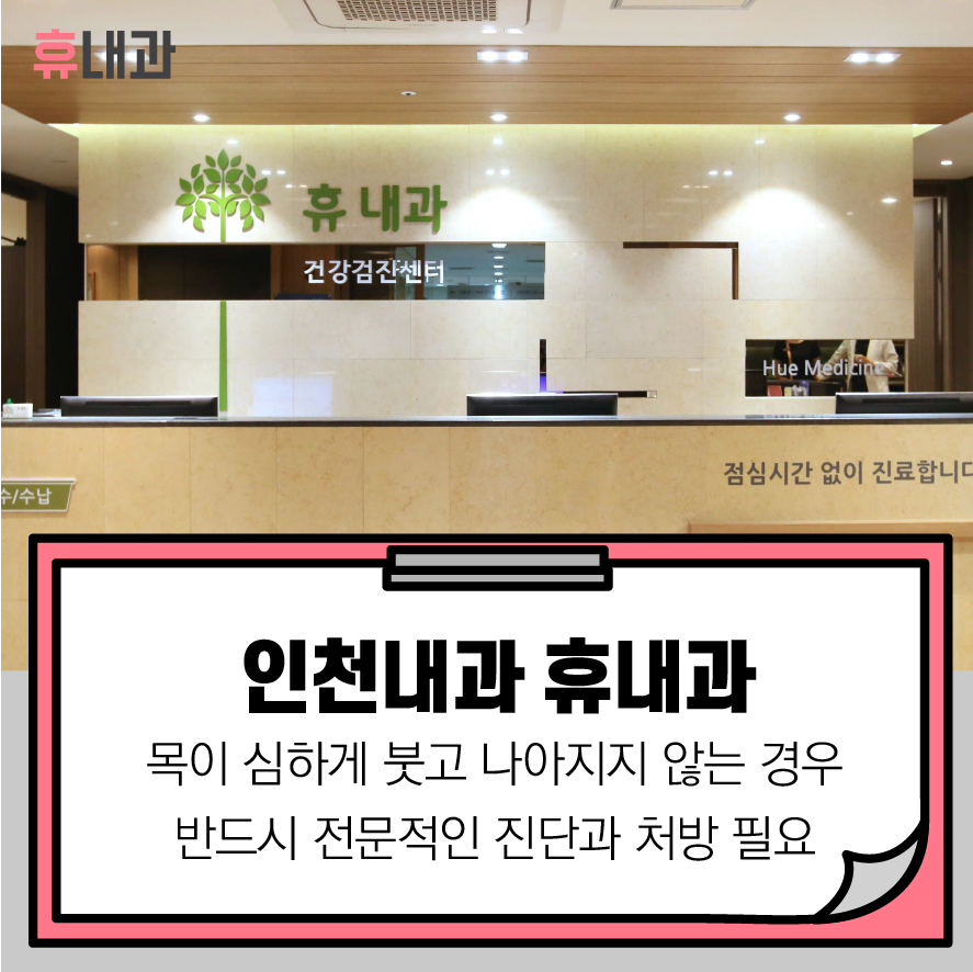 인천내과 편도염은 대부분의 경우 시간이 지나면 증상이 완화되지만 목이 심하게 붓고 나아지지 않는 경우에는 합병증을 유발할 수 있으므로 방치하지 마시고 휴내과에 방문하여 전문적인 진단과 처방을 받도록 합니다.