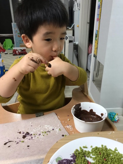 수아도 만들어볼게~ 하고 수아도 초코를 중탕해서 옆으로 준비하고 막대과자도 줬더니 초코를 막대과자에 찍어 일렬 종대로 세워놨다.