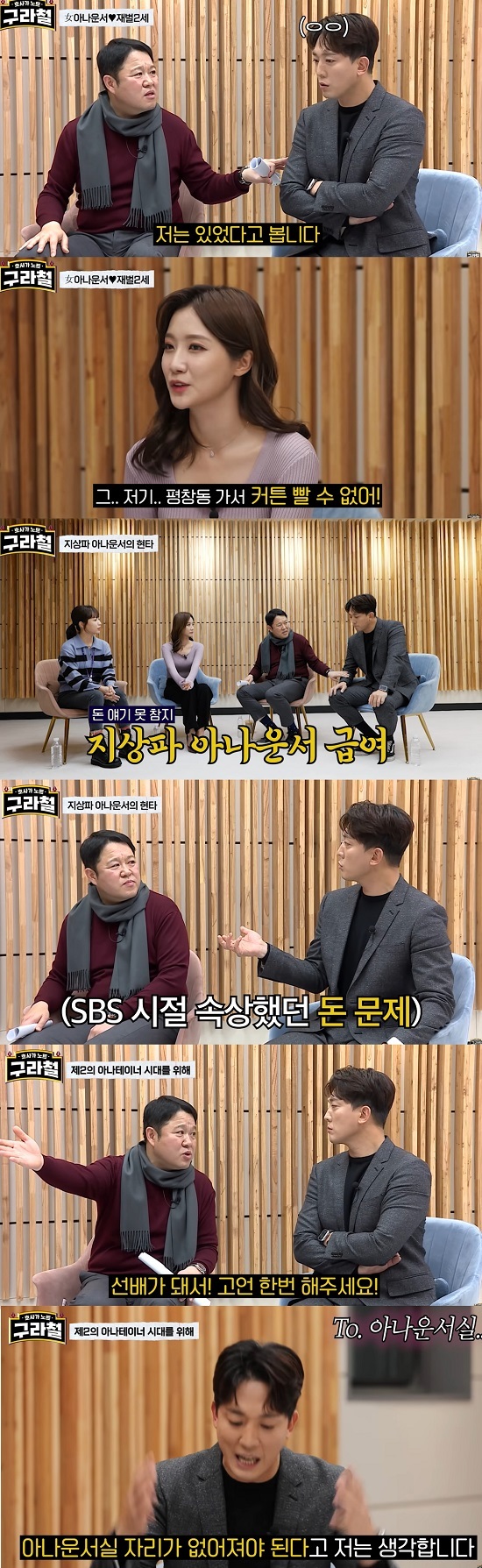 이어 ‘예능에서 멀어진 아나운서들’이라는 주제로 대화를 이어갔다.김구라는 “예전에는 KBS가 정책적으로 아나운서들이 중심 역할을 할 수 있는 프로그램을 많이 해왔다”며 ‘아나테이너’ 열풍을 주도한 KBS에 대해 말했다.김구라는 “요즘 PD들도 프로그램을 한번 론칭하기가 쉽지 않다”며 “한번 하다 보면 평생 기회가 오지 않을 수도 있고, 그러면 우리도 ‘베스트’로 가자며 예전만큼 그렇게 (예능에 출연할 수 없다)”고 전했다.김환은 “저도 나오기 전에는 왜 거기 하나 못 넣을까”라는 고민을 많이 했다. 왜냐하면 저희는 제작비도 안 들어요”라고 말했다. 김환환이 말을 꺼내는 동시에 박지민 김도연 아나운서도 우리는 2만원 3만원이라고 공감했다. 김구라는 「그런데 그 2만원에 집착하지 않는다는 것인가」라고 쓴웃음지었다.「지상파 아나운서의 현상타」라고 하는 테마로 대화를 계속해 김구라는 「아나운서의 급여 수준은 만족스러운 것이 아닐까요」라고 물었다. 김환은 솔직히 말해 연봉과 관련해 아주 좋은 일임에 틀림없다며 SBS 시대의 금전 문제를 털어놓았다.백년의 손님을 갔다가 정글의 법칙에 가면 지금은 8,000원의 출연료를 받는데 8,000원은 출연료가 아니라 그냥 출장비일 것이라며 우리에겐 부가적인 게 많이 있다. 헤어 메이크업도 받아야 하고 연예인들과 함께 있으니 아나운서 너무 많다고 정장만 입고 있을 수는 없지 않은가. 분위기에 맞춰야 하기 때문에 옷도 사 입어야 하고 내 돈을 쓰는 셈”이라고 말했다.이어 “한 달에 월급을 따지면 방송 안 하는 사람보다 못하다”며 가시화되고 있다고 전했다.