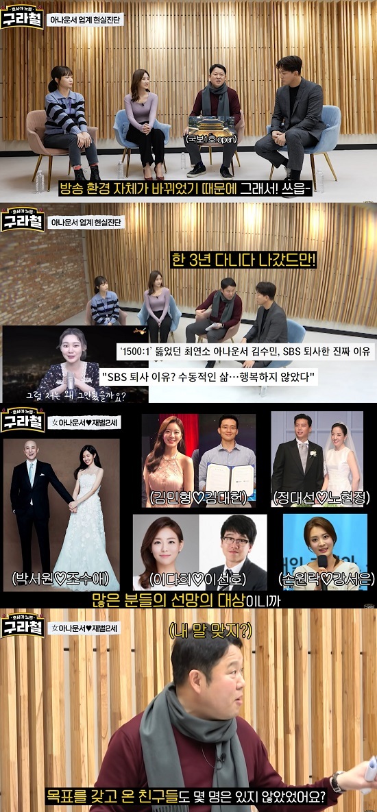 전 SBS 아나운서 김환이 입사를 목표로 재벌 2사와의 결혼을 생각하고 있는 아나운서가 실제로 있었을 것이라고 한다.유튜브 채널 그라철은 11일 1000 대 1의 경쟁률을 돌파하면 연예인 10,000명과 경쟁?이라는 제목의 동영상을 올렸다. 게스트로는 전 SBS 아나운서 김환, MBC 아나운서 박지민, KBS 아나운서 김도영이 출연했다.김구라는 “지난 한 해 사실상 아나운서가 더 많이 이동했다”며 “전 SBS 김수민은 3년간 다녔다. 나왔다. 지금도 선망의 대상이고 경쟁률 1700:1이 되곤 하는데. 아무튼 요즘 아나운서들은 어떤 고민을 하는지 궁금했다.김환은 “입사 당시 SBS에 정착했고, 그래도 메인 MC가 돼 뭔가 프리하기보다는 그래도 내가 아나운서의 꿈을 이루자는 생각이 있었다”고 말했다.이에 김도영 아나운서는 “왜 나오셨어요?”라고 물었고, 김환은 “달라졌어요. 40대 넘어 행정직이 되기 싫었고 나는 방송이 좋아 입사했다며 언론이 많이 늘어나니 종편도 나오고 싶은 마음이 커지니까 당연히 하고 싶었다고 답했다.김구라는 「종편의 알토란?」이라고 웃음을 자아냈다. 김환은 「기적의 습관, 똥개네, 골벤져스 따위를 하고 있습니다. 나도라고 반격했다.
