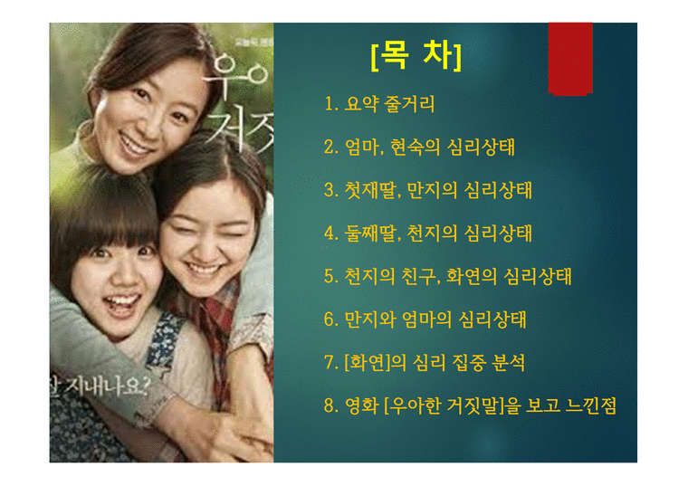 홀로 두 딸을 키우는 쿨한 엄마 현숙(김희애)은 자신에게 주어진 삶을 견디며 하루하루 고군분투하고 있습니다. 갑작스러운 천지의 죽음에도 불구하고 남은 가족을 위해 아무렇지 않은 척합니다.그러나 천지의 죽음에 대해 알면 알수록 가슴 깊은 곳에서 나오는 슬픔, 분노에 시달리고 있습니다. 정말 김희애 배우의 애틋한 연기를 보고 있으면 어느새 딸을 잃은 엄마처럼 소리도 내지 못할 정도로 깊은 슬픔에 빠지게 됩니다. 만치 영화 우아한 거짓말의 등장인물천지의 누나로 현숙의 큰딸을 만지는 엄마를 닮았으며 평소 쌀쌀한 성격을 가지고 있습니다. 다소 내성적인 천지와는 달리 쿨한 면모가 느껴지는 인물입니다.하지만 천지의 죽음을 보고 자신의 삶을 돌아보며 괴로워하고 있습니다. 특히 현숙이와 함께 견디는 삶을 살아가는 모습을 볼 때 너무 아쉬운 마음이 들었습니다. 화영(김유정) 영화 우아한 거짓말의 등장인물천지의 친구이자 화영(김유정)은 영화가 진행되면서 천지의 죽음 그리고 학교폭력과 관련된 학생입니다. 이한 감독은 화영을 직접적인 가해자를 설정하지 않고 또 다른 피해자일 수도 있다는 시선으로 바라보고 있습니다. 학교폭력을 무조건 가해자와 피해자로 나누는 등 우리의 선입견을 깨고 앞으로 나아가야 할 방향을 제시한 것 같습니다. 영화 우아한 거짓말 평점 정보우아한 거짓말’은 소설을 원작으로 한 작품인데 영화도 큰 호응을 얻었습니다. 특히 학교폭력이 소재인데 천지가 남긴 메모를 찾아가는 설정의 줄거리로 더욱 몰입할 수 있었습니다.우아한 거짓말 평점을 확인해보니 네티즌 8.41/관람객 8.23으로 특히 10대 소녀들의 평점이 높던데요. 아마 자기들 얘기라서 공감도 많이 되고 더 슬픔을 느꼈을 거예요. 이상으로 우아한 거짓말에 대한 포스팅을 마치겠습니다. 긴 글 읽어주셔서 감사합니다. 같이 읽으면 좋은 글소녀들을 위한 힐링 영화 이웃집 토토로이웃집 토토로 정보 이제 OST만 들어도 눈물이 흐르는 이유 숲속에 사는 나의 특별한 친구 이웃집 토토로는 미야자키 하야오 작품 중 내가 가장 좋아하는 영… blog.naver.com이웃집 토토로 정보 이제 OST만 들어도 눈물이 흐르는 이유 숲속에 사는 나의 특별한 친구 이웃집 토토로는 미야자키 하야오 작품 중 내가 가장 좋아하는 영… blog.naver.com이웃집 토토로 정보 이제 OST만 들어도 눈물이 흐르는 이유 숲속에 사는 나의 특별한 친구 이웃집 토토로는 미야자키 하야오 작품 중 내가 가장 좋아하는 영… blog.naver.com이웃집 토토로 정보 이제 OST만 들어도 눈물이 흐르는 이유 숲속에 사는 나의 특별한 친구 이웃집 토토로는 미야자키 하야오 작품 중 내가 가장 좋아하는 영… blog.naver.com우아한 거짓말 감독이 출연한 김희애, 고아성, 김유정, 김향기 개봉 2014.03.13.출처 – 네이버영화, 네이버TV