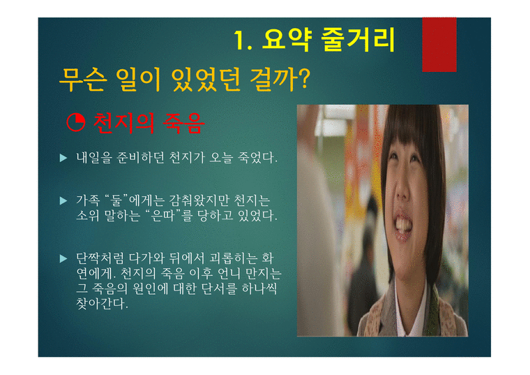 영화 우아한 거짓말의 가장 중요한 등장인물은 바로 천지(김향기)입니다. 평소 마음이 깊고 다정다감한 이 소녀는 학교폭력으로 인해 고통받고 있지만 가족들에게 거짓말을 하며 하루하루를 버티고 있습니다.