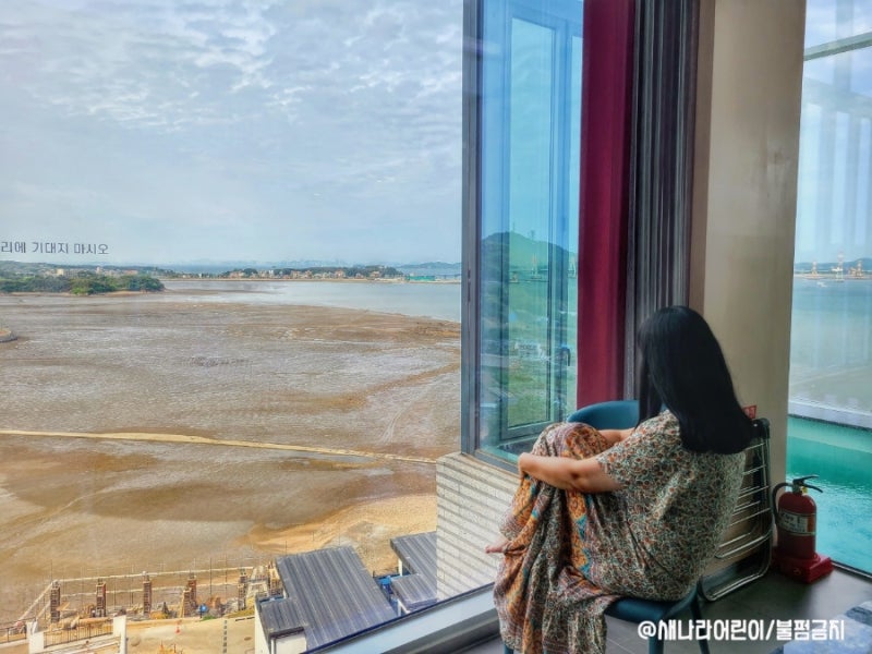 지하주차장에서 엘리베이터를 타고 바로 로비와 객실로 올라갈 수 있어 편리했습니다.조금 일찍 도착해서 1층에 있는 카페로 안내받았어요. 카페 너무 좋았어요.서해가 눈앞에 확~~ 보기만 해도 힐링되는 기분이고 인테리어도 깔끔해져서 사진찍기에도 너무 좋았어요.