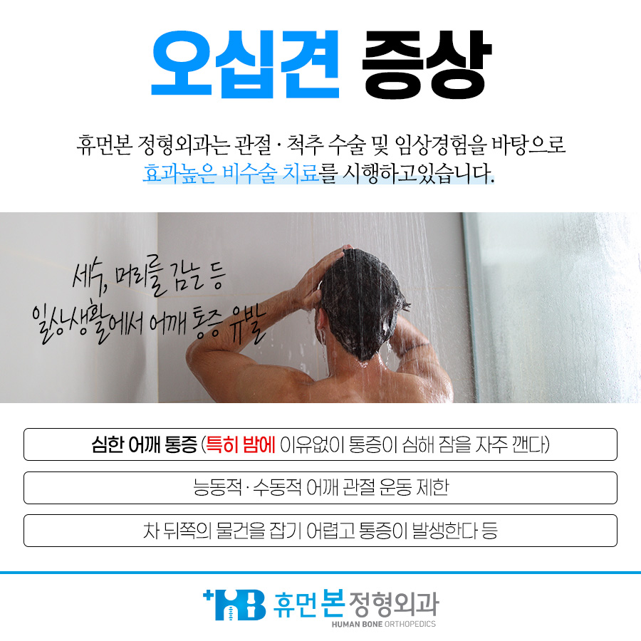 어깨의 통증을 1:1 맞춤 비수술 치료로 많은 환자들이 병원을 찾을 때 ‘오십견은 수술을 해야 낫는다’는 생각을 가지고 내원하시는 경우가 많습니다. 그러나 오십견은 수술을 해야만 하는 경우는 그리 많지 않습니다. 실제로 오십견 환자의 대부분은 무리한 어깨 활동을 피하고 지속적인 도수, 운동치료를 받는 비수술적 치료만으로도 충분히 좋은 효과를 기대할 수 있습니다. 본인의 신체적 특성, 생활습관 등을 고려하지 않은 운동치료는 오히려 근육과 건에 손상을 줄 수 있습니다. 따라서 환자 1:1 맞춤치료를 통해 예전의 어깨상태를 회복하고 재발을 막을 수 있습니다. 휴먼본 정형외과는 대학병원 및 전문병원에서 축적된 풍부한 관절·척추 수술 및 임상경험을 바탕으로 효과 높은 비수술 치료를 시행하고 있습니다.□관절강 내 주사요법□도수·운동치료□집중형 체외충격파치료(ESWT)□물리치료