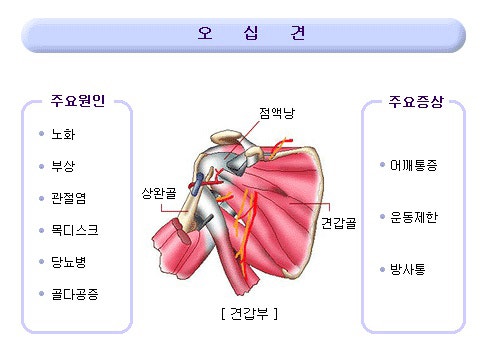 오십견 증상특별한 외상이 없거나 가벼운 외상 후 어깨 관절 부위에 둔통이 시작되면서 점차 통증이 심해지고 관절 운동의 제한이 나타납니다.특발성(원닌을 모르는 경우)의 경우 대개 50대 이후에 호발하며 환자는 다른 어깨괄호 환자와 마찬가지로 심한 동통, 야간통과운동 제한을 보이게 되며 누워있는 자세에서의 통증이나 불쾌감이 더욱 심해지고 야간통으로 인해 수면장애가 발생하기도 합니다.뿐만 아니라 처음에는 어깨를 안쪽으로 돌리는 것도 어렵고, 그 다음에는 팔을 앞으로 올리거나 밖으로 돌리는 것도 어려워집니다.예를 들어 세수를 하거나 머리를 감을 때 목덜미를 만지는 행동, 머리를 빗거나 블라우스 뒷단추를 채우는 행동 등이 어려워질 수 있다고 합니다.특징.오십견은 증상 발현 기간 및 양상에 따라 3기로 나눌 수 있다고 합니다(1) 제1기 통증기最初첫 증상부터 약 3개월간 지속됩니다.➆ 어깨를 움직이지 않을 때에도 통증이 나타납니다. ➩ 통증이 점차 증가하여 스스로 어깨를 움직이는 능동적 관절운동에 제한이 생깁니다. (2) 제2기 동결기 ➩3개월에서 12개월까지의 기간을 말합니다.➁ 어깨를 움직이지 않고 가만히 있을 때 통증은 완화됩니다➩ 만성적인 통증과 함께 수동적인 관절운동 범위가 제한됩니다➩ 3기➩ 12~18개월 또는 그 이상의 기간을 말합니다➩ 환자 스스로 엄격하게 제한된 어깨관절 범위를 극복하려고 하면 통증이 발생합니다➩ 이 기간 말기에는 통증이 없더라도 관절운동의 범위가 늘어난 것을 느끼며 객관적으로 운동 범위가 완전히 회복되는 것은 아닙니다➩ 통증은 매우 경미해지며 관절운동과 관련된 경우 통증이 나타납니다.