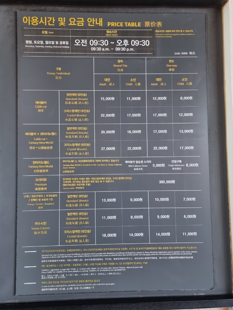 6인승 크리스탈 캐빈 성인 편도 1인당 1만7천원 나머지 8인승 일반 캐빈, 왕복 비용 등은 위 사진을 참조 전라남도 여수시 돌산읍 돌산로 3600-1 전라남도 여수시 자산4길 39 개인적으로 편도로 권합니다.반대편에 연결되어 있는 자산공원도 볼거리군요!그리고 좀 더 비싸지만 낮에는 바닥이 유리로 아래를 볼 수 있는 크리스탈 캐빈을 추천합니다! (물론 고소공포증이 있는 분은 일반 캐빈으로)