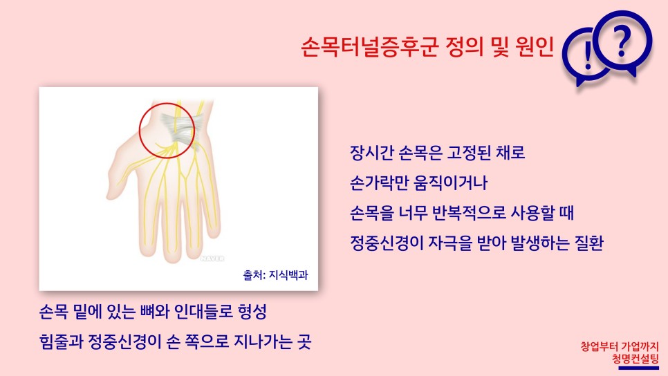 손목 터널 증후군은 여러 가지 원인으로 정중 신경이 자극을 받아 일어나는 질환입니다.
