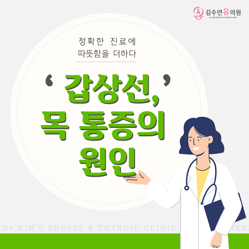 어느 날 갑자기 목의 통증에 취해서 불쾌감을 호소할 때가 있어요. 일반적으로 목에 이상을 느끼면 이비인후과를 찾아 진찰을 받는 경우가 많습니다. 만약 목의 통증과 함께 목 안에 이물감이 느껴지거나 목쉰 소리가 자주 나온다면 단순한 감기 증상이 아닌 갑상선 질환을 의심해 보아야 합니다. 갑상선과 관련된 질병은 대개 아무런 증상이 나타나지 않는 특징이 있어 자각이 쉽지 않지만 조기진단이 매우 중요한 질환이므로 정기적인 갑상선 검진이 필요합니다. 오늘은 남양주갑상선 김수연유의원에서 갑상선, 목 통증의 원인에 대해 알아보도록 하겠습니다.