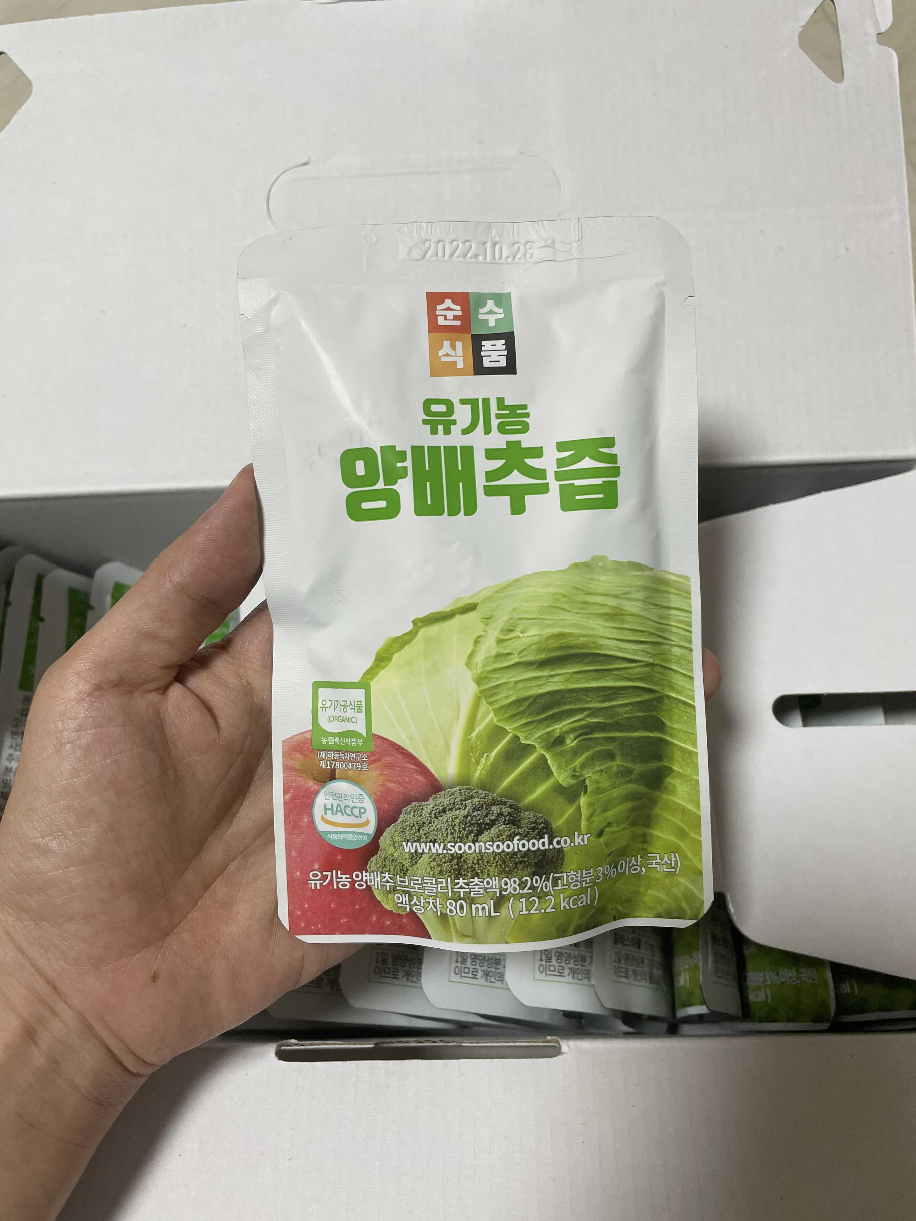 대용량으로 집에 있어야 안심할 수 있는 저 같은 사람들에게 충분한 유통기한은 최고의 서비스잖아요. 양배추의 효능은 1. 간단하게 4가지로 설명하겠습니다.양배추의 주성분인 비타민U는 여러가지 이유로 초래된 불쾌감을 덜어준다2. 겉잎에는 비타민A와 철분, 칼슘이 풍부하고 하얀 중엽에는 비타민B군과 비타민C 함유량이 높다3. 양배추는 고대 그리스시대부터 즐겨먹었던 채소로 미국 타임지가 선정한 서양 3대 장수식품 중 하나이다4. 식이섬유, 베카로틴, 라이신, 필수아미노산 등 다양한 영양소도 함유하고 있다80ml로 한 번에 섭취하기에도 적당한 양이었습니다.양배추즙을 마시는 것을 주저하는 이유, 저도 잘 알고 있습니다. 바로 맛 때문이죠?확실히 양배추즙은 양배추즙보다 사과나 브로콜리가 들어가는 것이 훨씬 마시기 좋다고 생각합니다. 사과가 들어가서 양배추 특유의 맛을 최대한 억제하고 조금 더 달콤한 맛이 나서 목넘김이 편하대요. 은은하고 건강한 단맛이 느껴져 아침에 간단하게 마시기 좋습니다양배추즙은 식혀도 따뜻하게 먹어도 상관없다고 합니다.저는 차갑게 먹는 게 더 맛있고 먹기 편할 것 같아서 냉장고에 두었는데 남편이 매일 아침 잘 먹어요.매일 섭취 중인데 100포라 그런지 아직 한참 남았네요. 유통기한도 충분하고 먹기 편하고 맛도 좋은 양배추즙을 찾으신다면 건강을 위해서 한번 드셔보세요.가성비 대용량으로 찾으시는 분들께 추천드립니다.#양배추즙 #양배추즙효능 #유기농양배추 #양배추사과즙 #순수식품 #건강관리