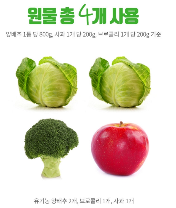 주재료인 양배추와 브로콜리는 국산품이면서도 유기 기공 인증을 받은 양배추를 사용한 안전관리 인증마크 HACCP 마크도 있어 안심하고 먹을 수 있는 순수 식품 양배추 브로콜리 즙
