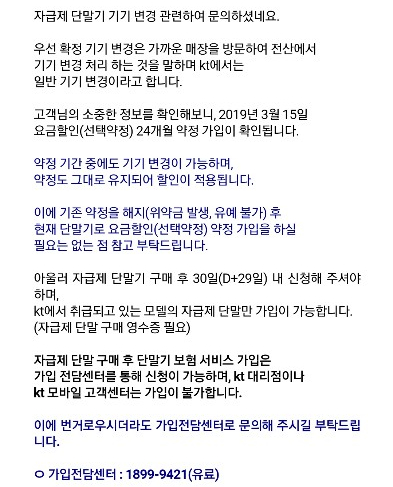 두 번째로 KT보험전문센터에 전화를 했다.자급제 휴대폰으로 보험에 가입하려고 하지만 일반적인 이변을 일으키면 위약금이 발생한다는 유심기변만으로는 보험에 가입할 수 없거나 물론 답변을 할 수 없다였다.또 위약금을 본인은 모르기 때문에 KT 고객센터에 문의하라고 했다. 이미 했는데만약 위약금이 발생하기 때문에 일반기종 변경을 못할 경우 약정이 끝난 뒤 자급제 휴대전화를 구입해 1년 안에 중고폰 보험에 가입할 수 있으니 그 방법도 고려해 달라고 권해주셨다.
