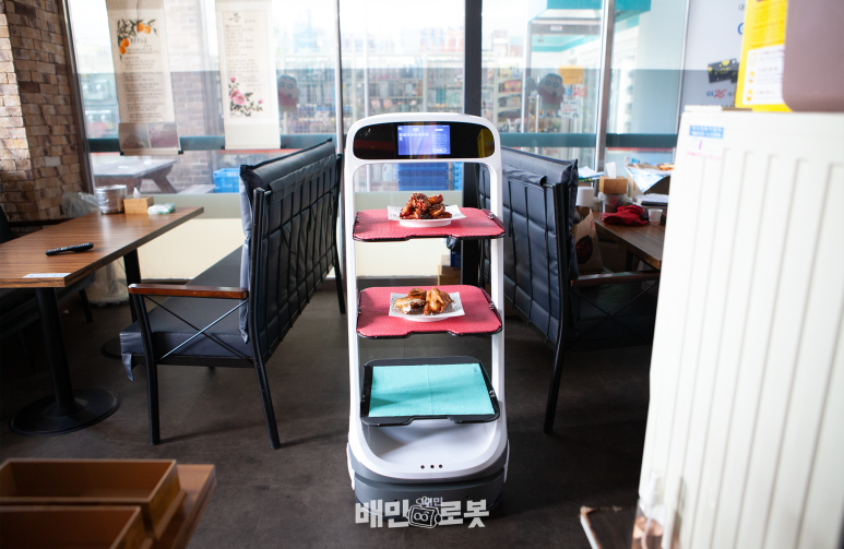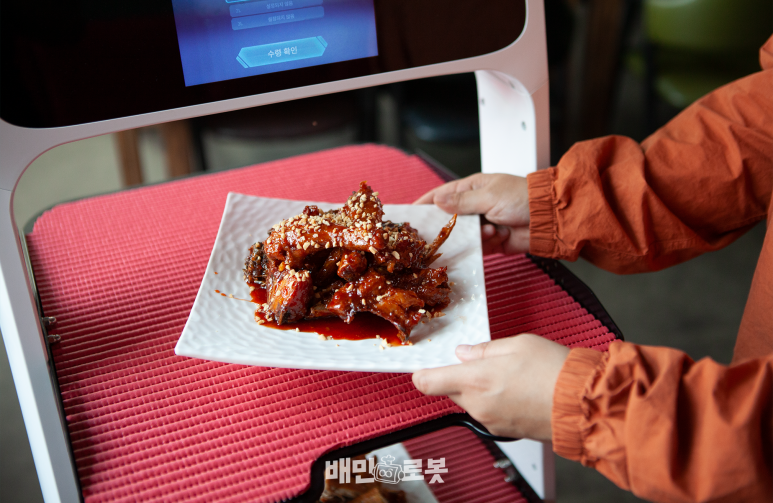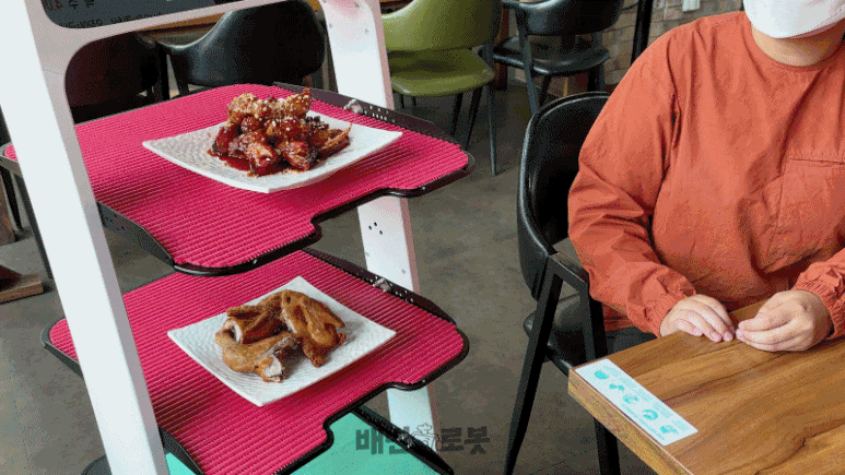 음식을 안전하게 테이블까지 서빙하여 비대면으로 안전하게 배달합니다.(안전X안전=배민서빙로봇델리?)