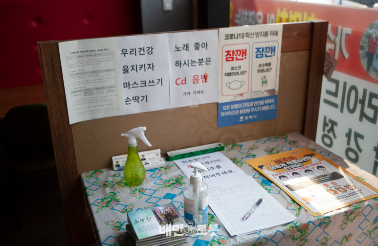 방역규칙에 맞춰 꼼꼼하게! 명단 작성 및 소독을 실시하고 있습니다.