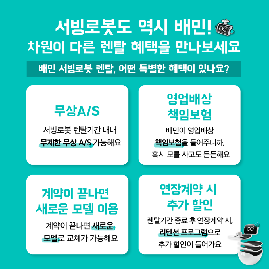 한달만 대여할 수 있고 대여기간 무제한 A/S, 영업배상책임보험 서비스를 제공하니 너무 든든해요!?