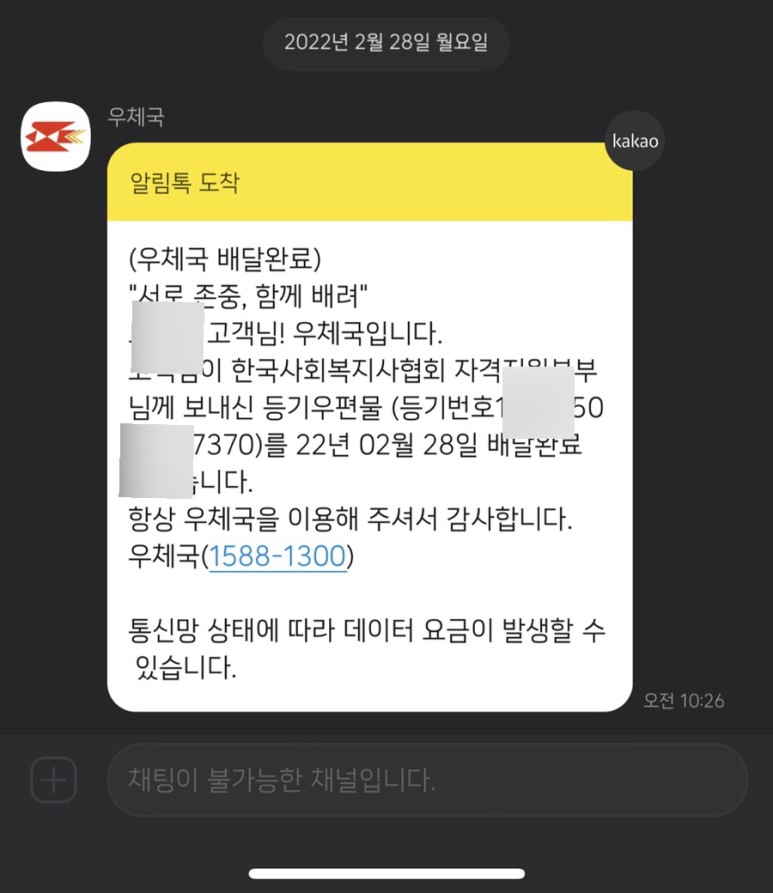 1월 22일 사회복지사 1급 시험을 본 뒤 2월 23일 합격 예정자에게 문자서비스를 제공한다고 했는데 아침 9시에 합격 통지가 카카오톡 알림 서비스로 왔다.