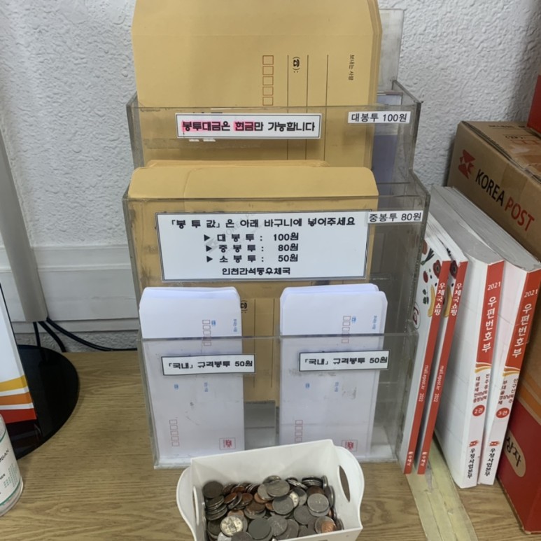 우체국에 봉투가 준비되어 있으니까 따로 준비할 필요는 없다.