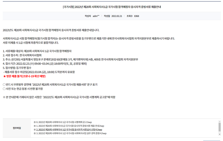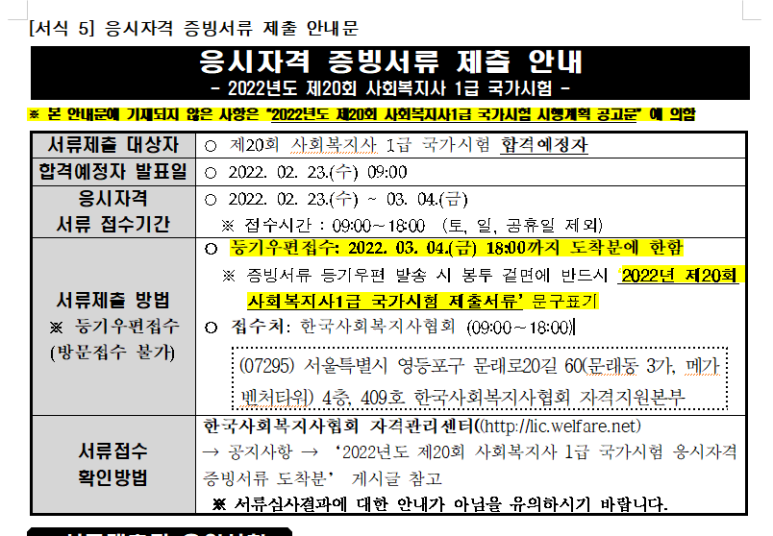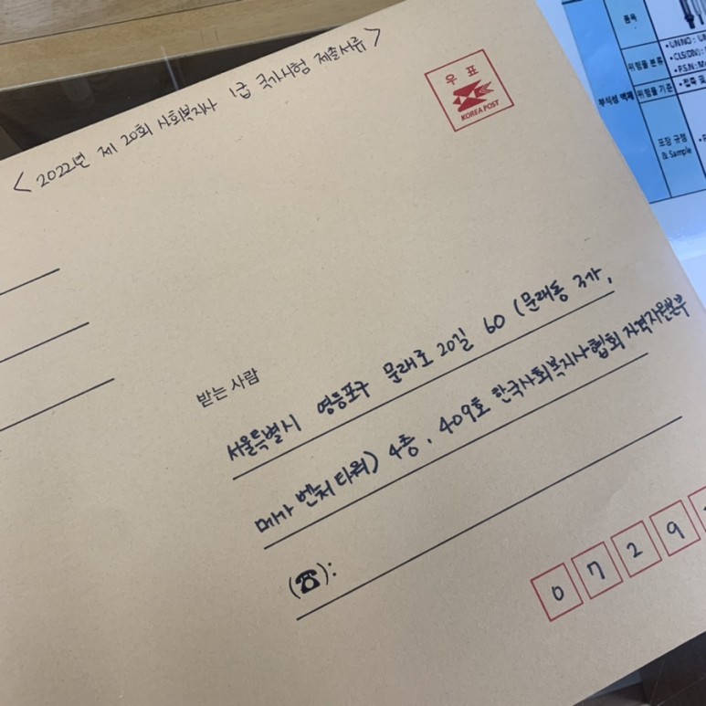 신청서에는 2급 자격증 번호가 필요하므로 2급 자격증 번호를 확인하고 등기우편 발송 시 서류봉투 앞면에 2022년 제20회 사회복지사 1급 국가시험 제출서류라고 반드시 적어 보내야 한다.