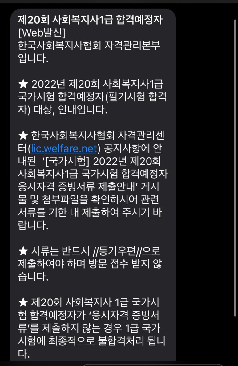 사회복지사 1급은 1급 시험 합격 후 응시자격에 대한 서류를 제출해야 한다.합격 통보를 받은 뒤 서류 제출에 관한 문자도 날아온다.
