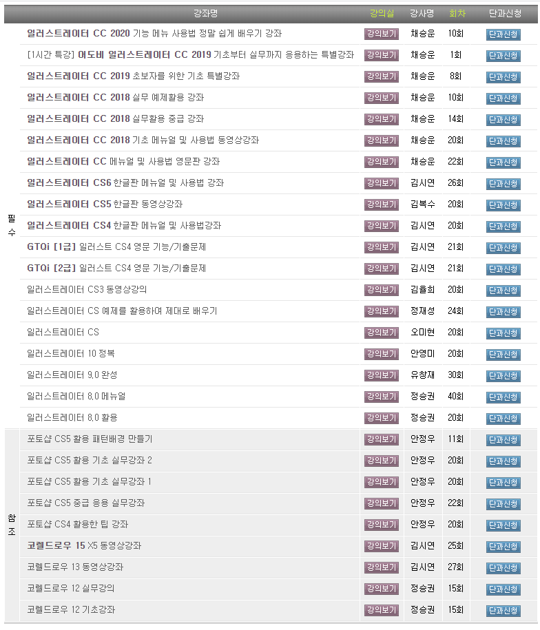 다음은 제가 듣고 있는 일러스트 강좌입니다.일러스트 강의는 GTQ 시험에 대비한 강의와 실무에서 사용하는 강좌가 따로 있기 때문에 다양한 방법으로 들을 수 있었습니다.일단 성취감을 얻고자 자격증을 따고 싶고 그 다음에 실무 강의를 들으면 조금 더 쉽게 이해할 수 있지 않을까 생각합니다.