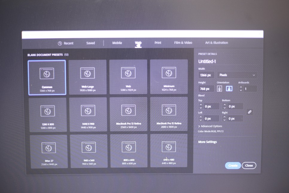 다양한 사이즈의 프리셋을 여는 것부터 시작.어떤 점에서는 포토샵보다 더 직감적인 부분이 있었어요.모바일, 웹, 프린트 등 정형화된 프리셋이 있어서 매우 편리하네요.