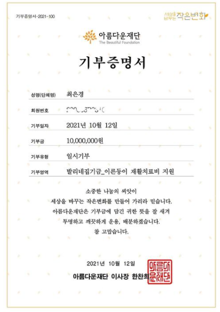 이번에 함께 공개한 사진에는 지난 10월 12일자로 1,000만원(약 1,000만원)을 기부한 아름다운재단의 기부증명서가 포함돼 있었다고 하는데, 최은경 이상엽씨 부부가 누적 기부액은 2003년부터 이달까지 약 2억240만원이라고 합니다.