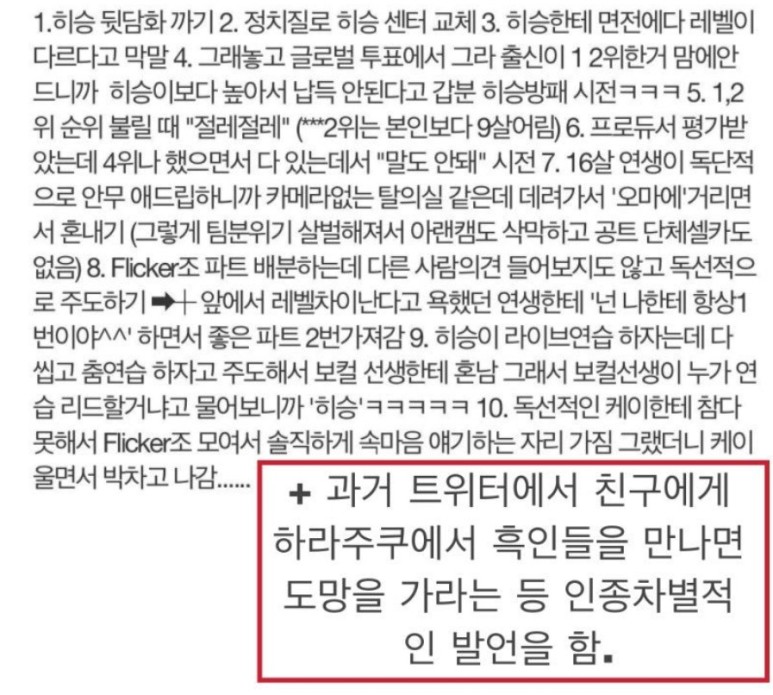 나는 인종차별적 발언보다 그동안 아일랜드에서 보여줬던 행동과 언어가 더 문제라고 생각한다. 그라운드에 온 멤버가 자신보다 투표 순위가 높은 것을 보고 고개를 저으며 표정이 나쁜 장면을 잊을 수 없다. 이희승에게 넌 나랑 차원이 다르니까라며 막말을 한 것도. 이런 걸 솔직하다고 두둔하는 팬들도 있었는데 본인이 남들이 보는 앞에서 그런 말을 한다면 과연 그런 말을 할 수 있을까? 사실이니까 솔직하게 말해도 된다고? 뭐가 사실이야? 생각하니 또 어이없어ㅠㅠㅜㅜㅋ