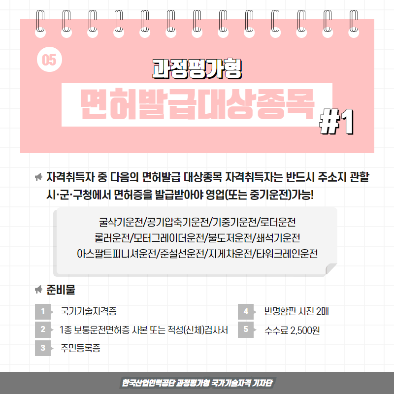 자격취득자중 위의 모든 면허 발급대상 종목의 자격취득자는 반드시 주소지 관할 시군구청에서 면허증을 발급받아야 영업 또는 중기운전을 할 수 있습니다! 면허증 수령 시 필요한 준비물은 위와 같으니 발급 시 꼭 지참하시기 바랍니다.