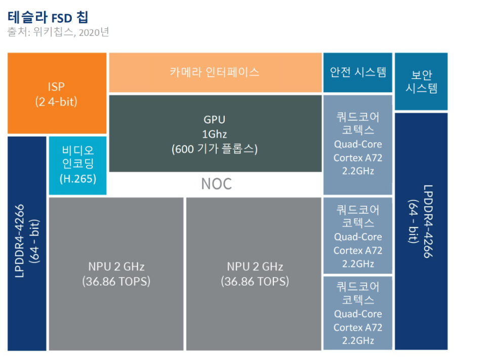자동운전팁의 중요성=자동운전 자동차는 내장센서를 이용하여 방대한 양의 데이터를 수집합니다. 각 차량은 수집된 데이터를 기반으로 실시간으로 머신러닝 모델을 돌리는데, 이때 강력한 연산 능력이 필요합니다. 따라서 자율 주행 칩의 대부분은 CPU (중앙 처리 장치), GPU (그래픽 처리 장치), NPU (신경망 처리 장치), ISP (이미지 시그널 프로세서)가 하나로 통합된 단일 칩 (SoC*)을 사용함으로써 연산 능력을 향상시킵니다. 대표적인 예로서, 현존하는 팁 중 가장 우수하다고 평가되는 테슬라 FSD 팁은 범용적인 CPU 3개(ARM 기반, 12-코어), 인공신경망을 위한 NPU 2개, 후처리를 위한 GPU 1개로 집적되어 있습니다.* SoC (System-On-Chip) – 한 개의 칩에 다양한 시스템 집적하여 연산, 데이터 저장, 아날로그 및 디지털 신호 변환 등의 기능을 한 번에 수행할 수 있는 단일 칩 반도체를 말합니다.