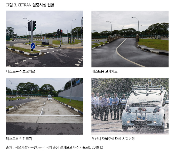싱가포르 CETRAN은 남양공과대학과 인접한 클린테크 파크(Clean Tech Park)내에 위치하고 있으며 약 20.000㎡ 면적에 횡단보도 및 교통표지판을 설치하여 시가지 도로와 빗물 시뮬레이터를 구현 운영하고 있습니다.CETRAN과 인접한 남양공대 내부 도로에서도 자율주행 및 C-ITS 관련 인프라를 구축하여 테스트베드 실험 후 실제 도로에서도 실험이 가능한 환경을 제공하고 자율주행을 위한 종합 실험환경을 제공하고 있습니다.