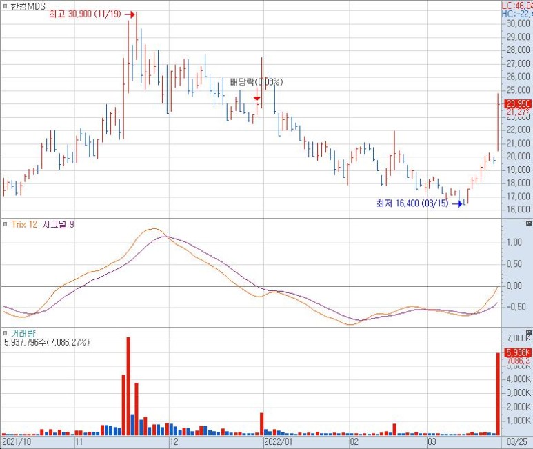 종가는 23,950원으로 전날에 비해 +4200원 및 +21.27% 변동된 주가로 시작가는 20,400원, 최고점은 24,800원, 최저점은 20,400원입니다.