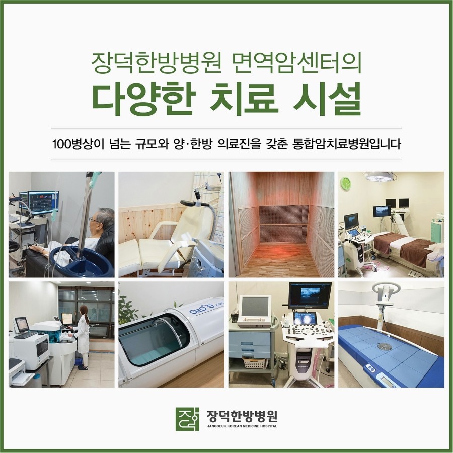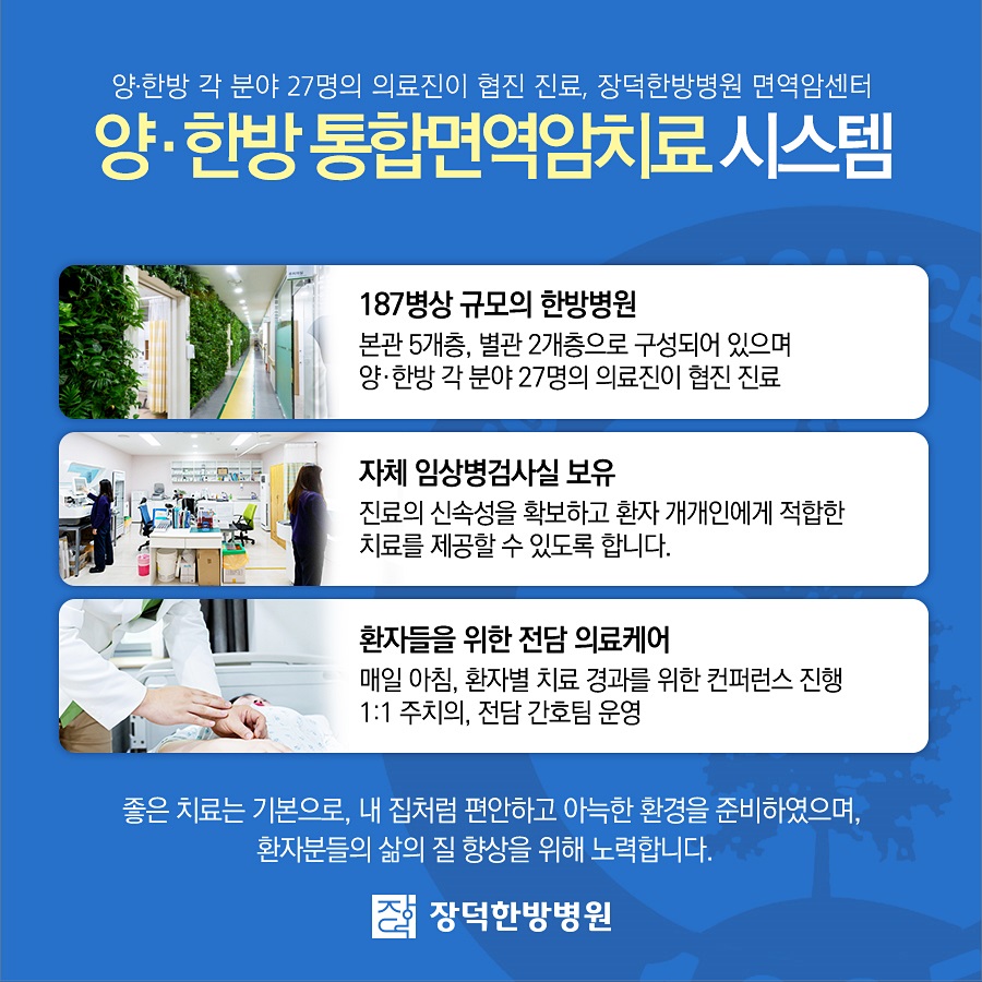 장덕한방병원 면역암센터에서는 개인 암환자에게 최적의 면역암 치료를 제공하고 있습니다. 장덕면역암센터는 독일식 통합면역치료와 한의학 치료를 결합한 시스템을 구축하여 한의학과 양의학의 긴밀한 협진으로 진행되는 효과적인 면역력 관리가 가능합니다. 매일 아침 진행되는 컨퍼런스를 통해 환자 개개인의 상태와 치료경과를 판단할 수 있도록 일대일 주치의 제도를 시행하고 있으며 전담간호팀의 세심한 관리를 통해 면역력을 관리합니다.