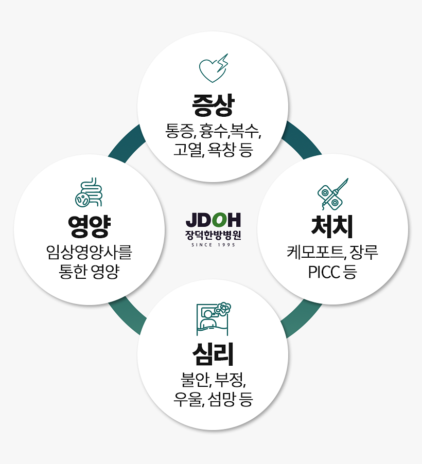 또한 장덕한방병원 면역암센터에서는 급성 기암 증상을 보다 효과적으로 완화하기 위한 목적으로 혈액종양내과 박재후 원장과 긴밀히 협진하여 진료합니다. 암의 통증, 치료 후 발생하는 통증, 감염관리, 우울증 및 불안장애관리, 혈액부족문제관리, 영양결핍관리 등 전반적인 문제에 대한 케어가 가능합니다.