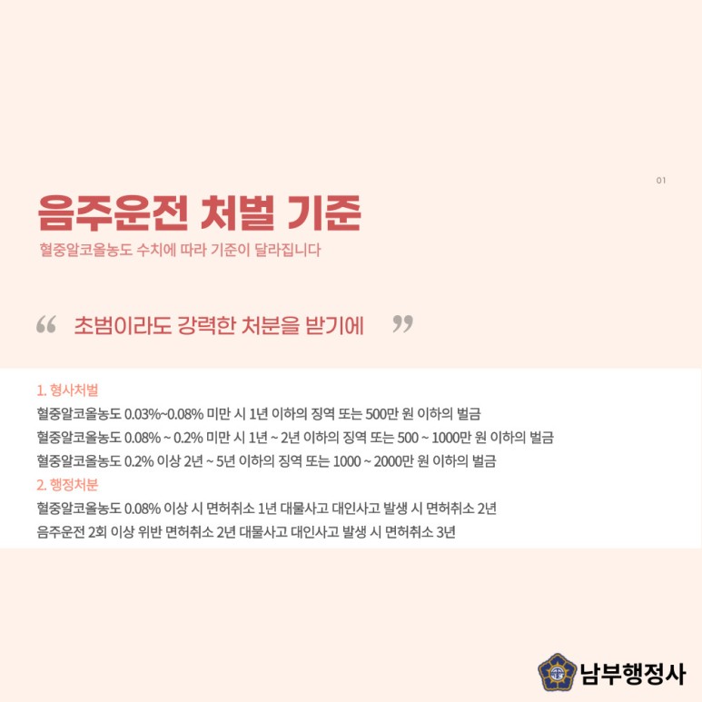 음주운전 처벌은?음주운전 신고로 적발될 시 형사와 행정처벌을 받게 되며, 혈중알코올농도 수치로 자신이 받을 처벌기준을 확인하시기 바랍니다. 현재는 초범이라도 엄한 처벌이 내려져 있기 때문에 전문가의 도움을 받아 해결하는 것이 중요합니다.