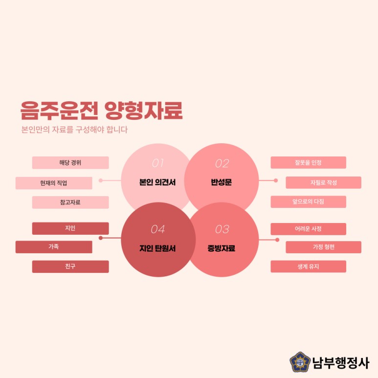 - 2. 행정처분 혈중알코올농도 0.08%이상인 경우 면허취소 1년, 대물사고 또는 대인사고 발생시 면허취소 2년, 음주측정거부 면허취소 1년에 해당합니다.선처를 요구해 벌금을 감경해야 하기 때문에 음주운전 신고로 적발되어 처벌을 받게 되면 자신의 잘못된 행위에 대해 반성하고 선처를 구해야 합니다.따라서 양형자료를 구성하여 제출해야 하는데, 자료는 경찰 조사시 담당 조사관에게 제출해야 합니다.그 후 사건이 검찰에 넘겨져 검사 배분 후 최종 판결을 내리기 전에 검토하게 됩니다.