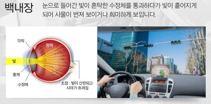 백내장은 수정체의 단백질 성분이 변화하여 탄력이 떨어지고 투명했던 수정체가 하얗게 흐려지면서 생기는 안질환입니다. 세계 보건 기구(WHO)에 의하면, 매년 온 세상의 1,600만명이 백내장으로 실명하지만, 백내장의 20%가 자외선에 의해서 생긴다고 합니다.백내장은 수정체가 탁해지면서 안개가 낀 것처럼 흐릿해지는 것이 일반적인 증상입니다.