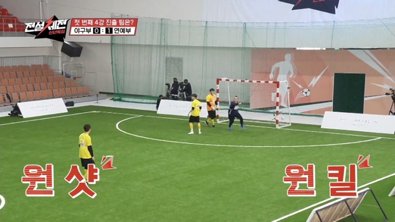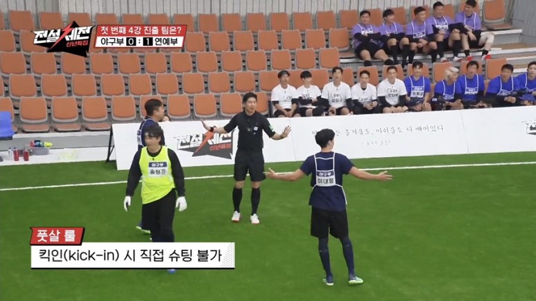 후반전에선 야구부가 원샷으로 골인했지만 풋살규칙에 따라 킥인할 경우 직접 슛이 불가능.?