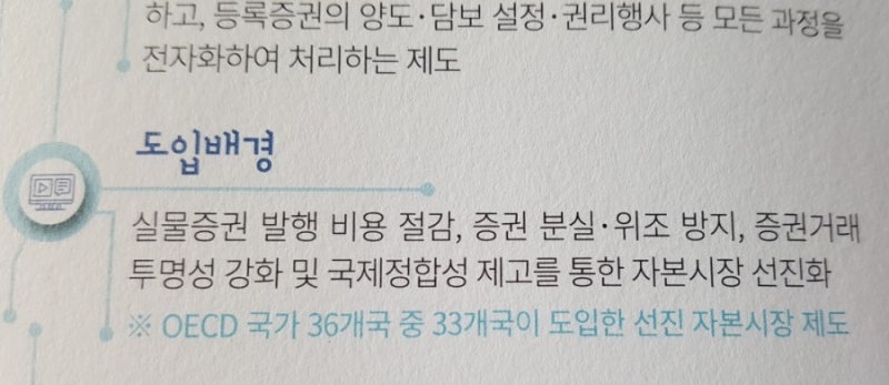 도입 배경 실물 증권 발행.비용 절감 및 증권 분실 위조 방지.증권거래의 투명성 강화 및 국제정합성 향상을 통한 자본시장 선진화