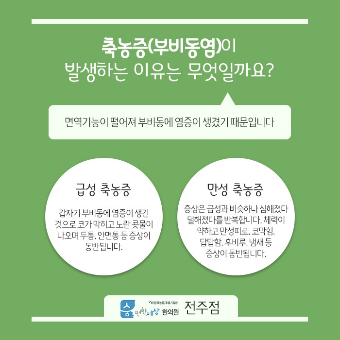 전주축농증한의원에서는 이런 증상이 더 심해지고 시간이 지날수록 호전되지 않으면 이는 후각에도 이상이 생겨 만성 기침과 두통과 집중력 저하, 그리고 염증이 다른 기관으로 옮겨지는 중이염이나 기관지염 등을 동반하기도 합니다.