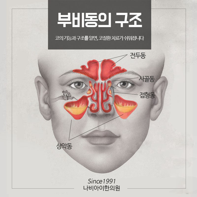 노랗고 점성이 강한 끈질긴 농사가 계속 흐르며 주변에 압통까지 동반되는 질환을 축농증이라고 합니다. 이것을 다른 말로는 부비강염이라고 합니다. 부비강은 비강과 안구치 사이에 비어 있는 공간으로 공기가 가득차 완충지대 역할을 합니다.