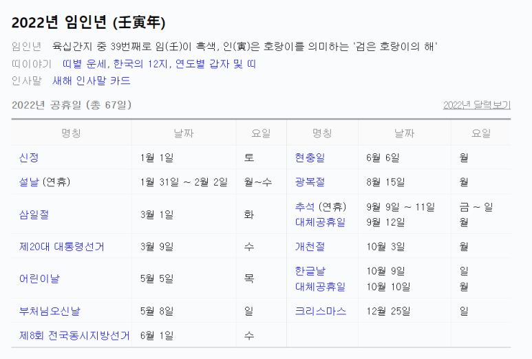 임인년의 휴일과 뜻(출처:네이버) 매년 십간과 십이지가 순환하여 갑자, 을축, 병인, 순으로 해가 바뀌는데 60번의 조합이 순환되면 다시 처음으로 돌아옵니다. 임인년은 60갑자 중에서 39번째지요. 2021년은 신축년, 2022년은 임인년, 2023년은 계묘년이 되었네요.