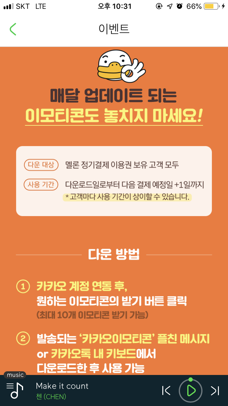 그리고 새로운 이모티콘은 다운 진행! 다음달 멜론 카카오톡 이모티콘 이벤트에는 어떤 이모티콘이 나올지 기대되네요.♡⁺◟(●˙▾˙●)◞⁺♡