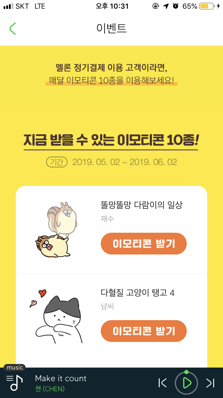 지난달부터 멜론 카카오톡 이모티콘 이벤트가 10종의 이모티콘을 한꺼번에 주고 달마다 업데이트 되는 것으로 바뀌었는데요! 6월 3일부터 이벤트가 시작되었습니다.