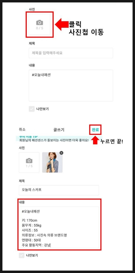 키 /몸무게 /사이즈는 필수!!의류정보를 참고하셔서 전신사진을 처음 올릴때는 입고계시는 옷이 품미제품이 아니어도 괜찮습니다.대신 의류 정보 (사진 속 의류 브랜드 이름) 얼려주세요!